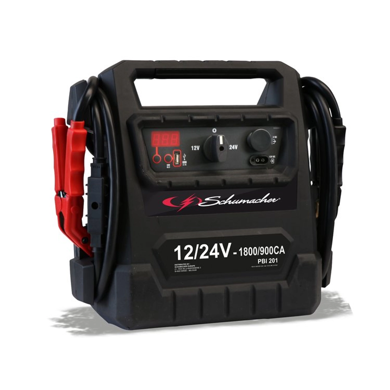 Booster profissional e potente de 12V / 24V para arranque sem problemas em automóveis e veículos pesados. Tem instalado duas baterias de 12V que conseguem ter uma capacidade de 1800A em 12V e 900A em 24V. Dispõe de um display para visualizar a voltagem da bateria e o alternador da viatura, com alarme de polaridade invertida e protecção anti-pico.