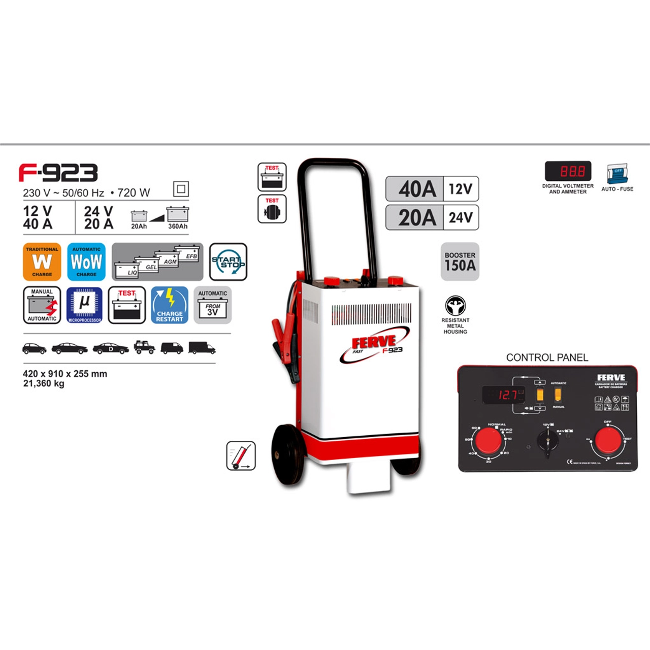 Os carregadores rápidos FERVE são a solução mais eficaz para ter uma bateria completamente carregada com o mínimo de tempo possível, onde reunem num aparelho só as seguintes funções: verificação de polaridade, verificação do estado de carga da bateria, verificação do funcionamento do alternador, carga normal, carga rápida e ajuda ao arranque (BOOSTER).