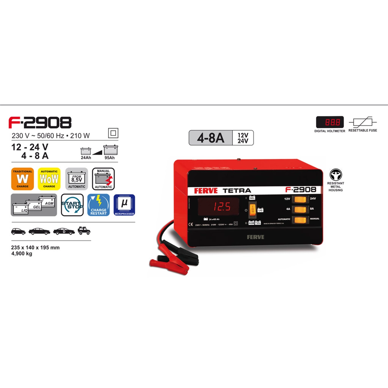 Os carregadores da gama TETRA adaptam-se a qualquer tipo de bateria, podendo o utilizador seleccionar a carga manual ou automática. Os modelos F-2914 / F-2916 / F-2920 dispõem da função RF "Ripple Free", que permite carregar a bateria sem a mesma ser desligada do veículo, eliminando assim a componente alterna e os picos de tensão.
