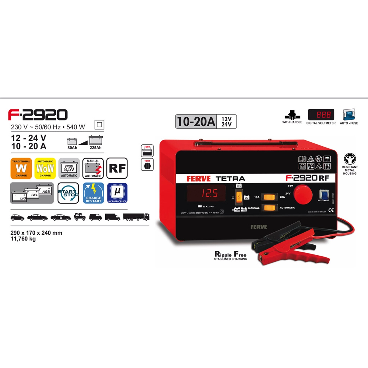 Os carregadores da gama TETRA adaptam-se a qualquer tipo de bateria, podendo o utilizador seleccionar a carga manual ou automática. Os modelos F-2914 / F-2916 / F-2920 dispõem da função RF "Ripple Free", que permite carregar a bateria sem a mesma ser desligada do veículo, eliminando assim a componente alterna e os picos de tensão.