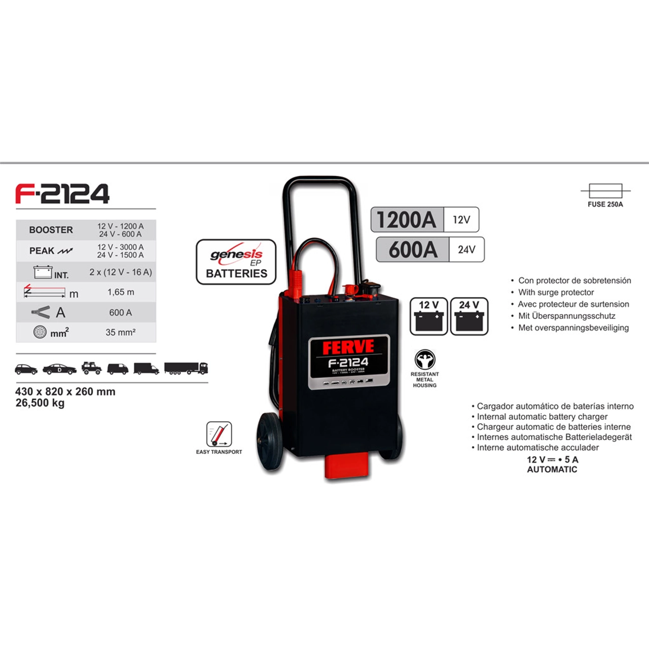 Os BOOSTER da FERVE são equipamentos profissionais autónomos e portáteis para múltiplas aplicações. O F-2124 tem a particularidade de incorporar um carregador automático interno de baterias.