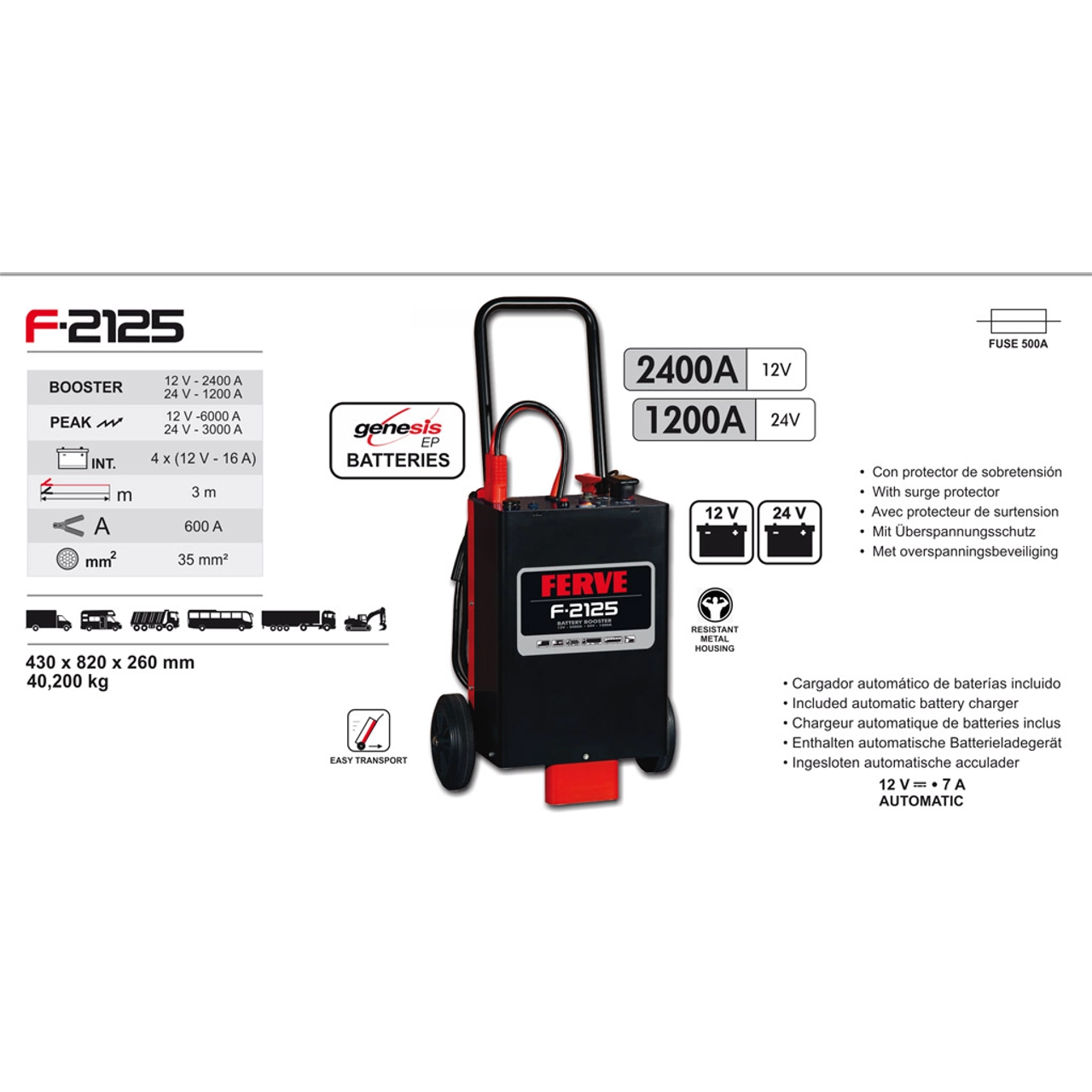 Os BOOSTER da FERVE são equipamentos profissionais autónomos e portáteis para múltiplas aplicações. O F-2125 tem a particularidade de incorporar um carregador automático interno de baterias.