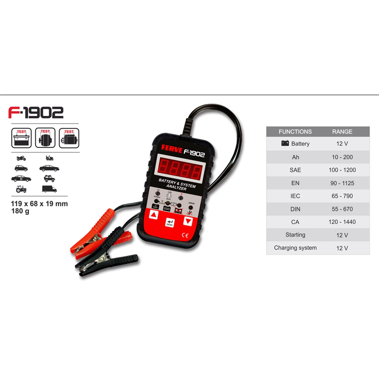 O aparelho de teste de baterias e alternador da FERVE F-1902, é o ideal para um uso sazonal, que indica a capacidade e estado da sua bateria.
