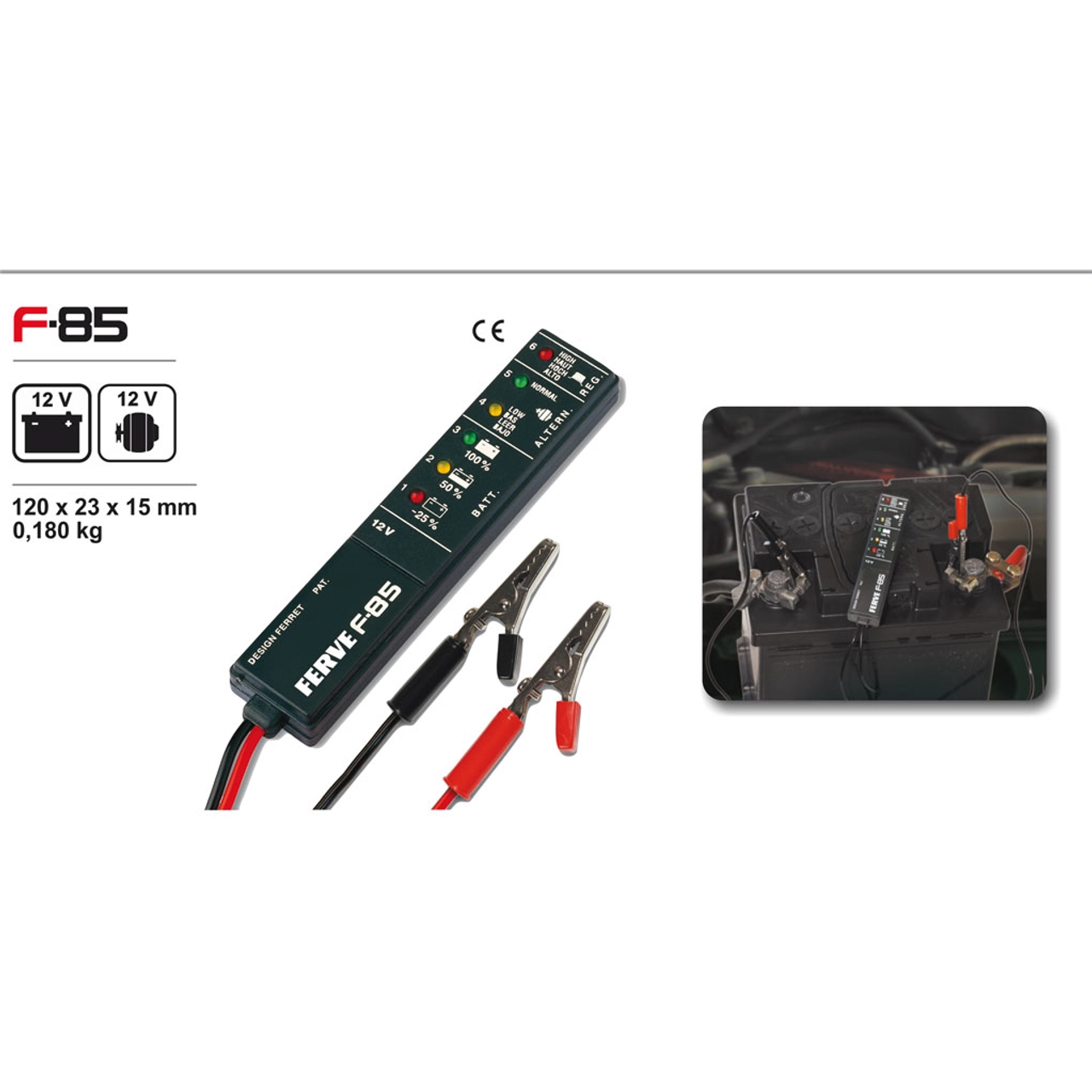 O aparelho FERVE F-85 é usado para medir a tensão da bateria 12V e do alternador.
